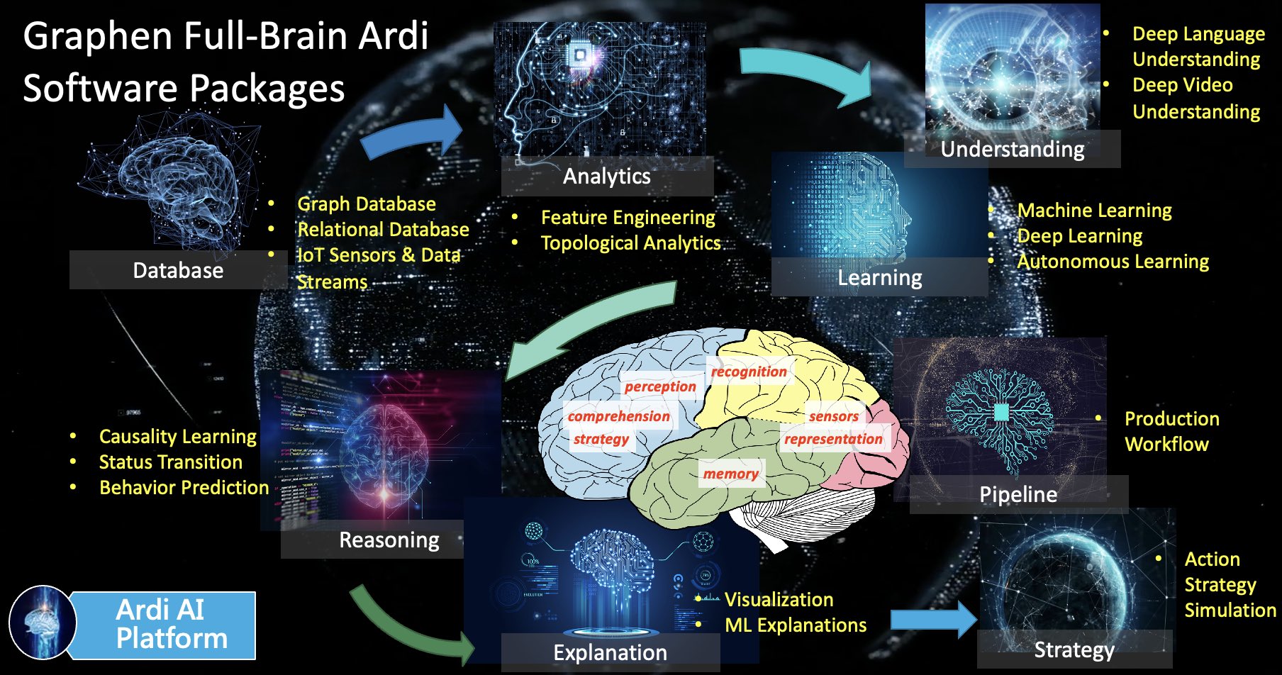 Graphen Ardi AI Platform includes eleven key modules: Memory, Perception, Learning, Reasoning, Understanding, Strategy, Expression, Personality, Emotion, Knowledge, and Action. They are organized and coordinated by a Pipeline. It empowers users to build industry specific solutions to solve complex problems from Fraud Detection, Genomic Analysis, Drug Development, and Car Diagnostics to building a smart energy grid.